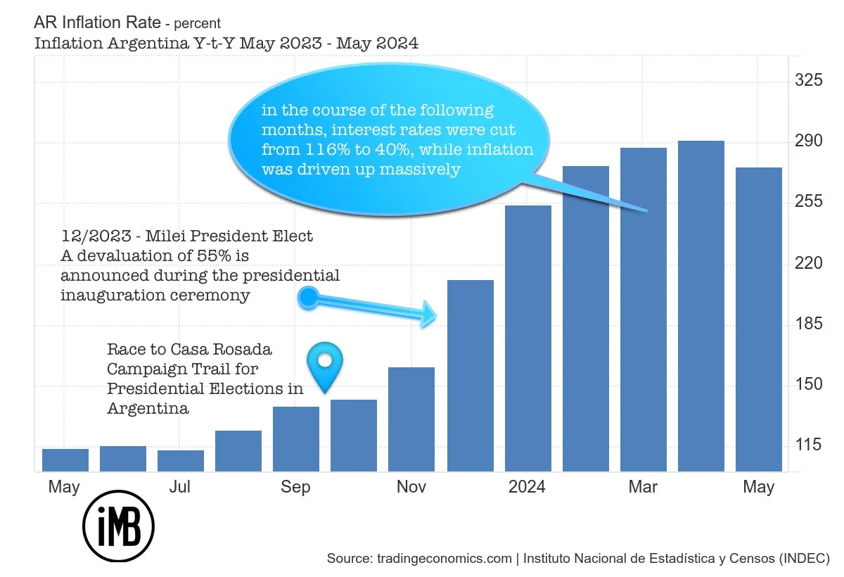As shown above, the current government of President Milei has so far introduced many measures from day one of his presidency to ensure that inflationary pressure remains high. This is not to say that the measures were wrong, but that they did not include balancing measures to keep the economy on track. This is most clearly illustrated by the firing up of inflation to almost 300% with a simultaneous interest rate cut to 40% within less than five months.