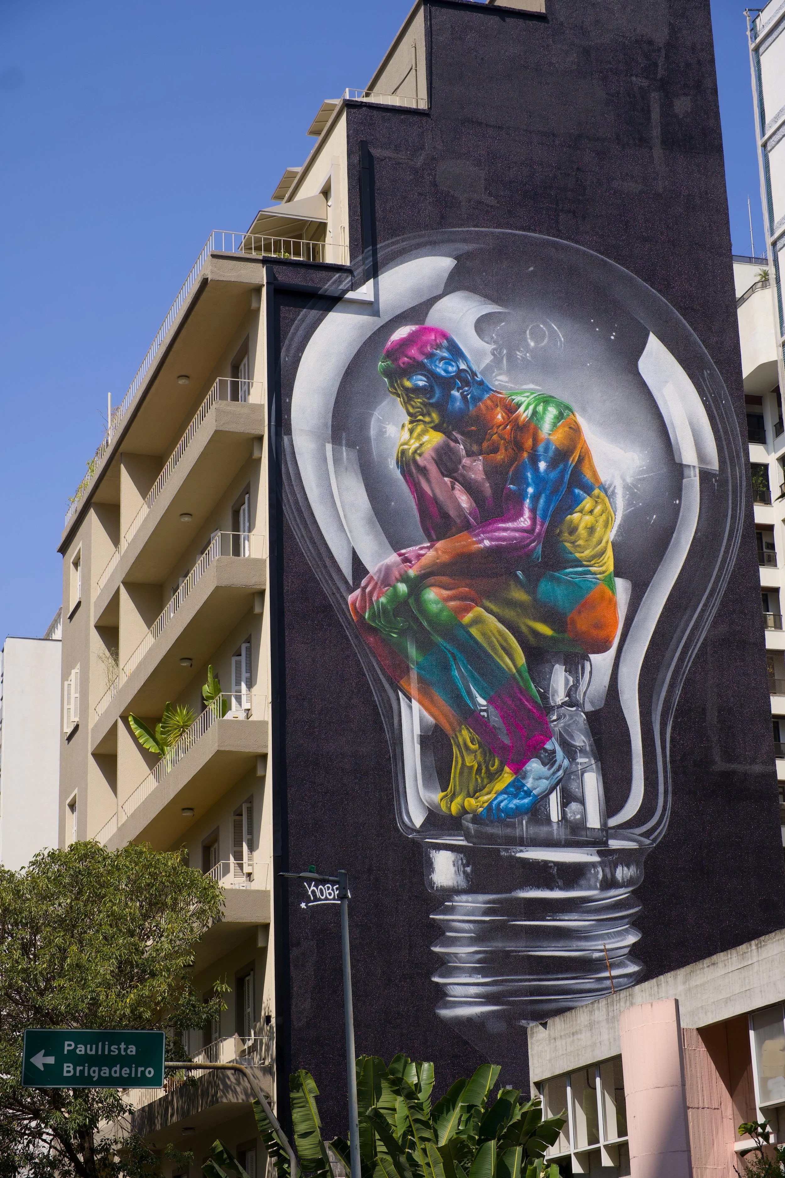 The artwork features a striking figure seated in a contemplative pose, encased within a luminous lightbulb—a brilliant metaphor for the birth of ideas. Kobra’s signature style shines through with a kaleidoscope of colors—vibrant reds, blues, yellows, and greens—blending seamlessly to create a human form that radiates energy and intellect. Positioned against the backdrop of a sleek, modern building, this piece elevates the everyday urban environment into a gallery of profound expression.