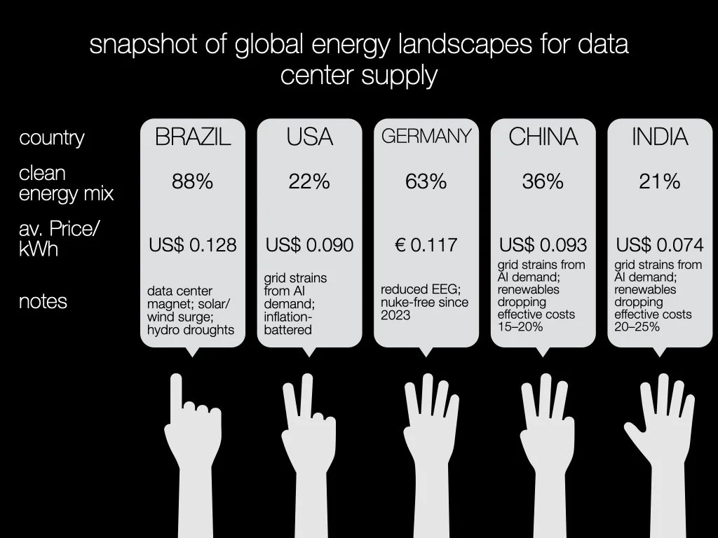 Brazil's renewable energy triumph is a key differentiator in the global data center race. While some nations chase a "nuclear renaissance," Brazil demonstrates that renewables offer faster deployment, lower costs, and fewer risks. Here's a comparative snapshot of global energy landscapes for data center supply in 2025: